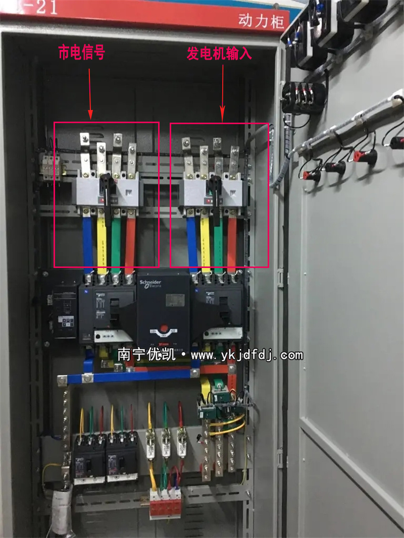 1、優(yōu)凱動力生產(chǎn)的柴油發(fā)電機組在控制箱右側(cè)有一個信號接線盒,里面有消防信號(154、103)和市電信號(A、B、C、0),380V,三相四線